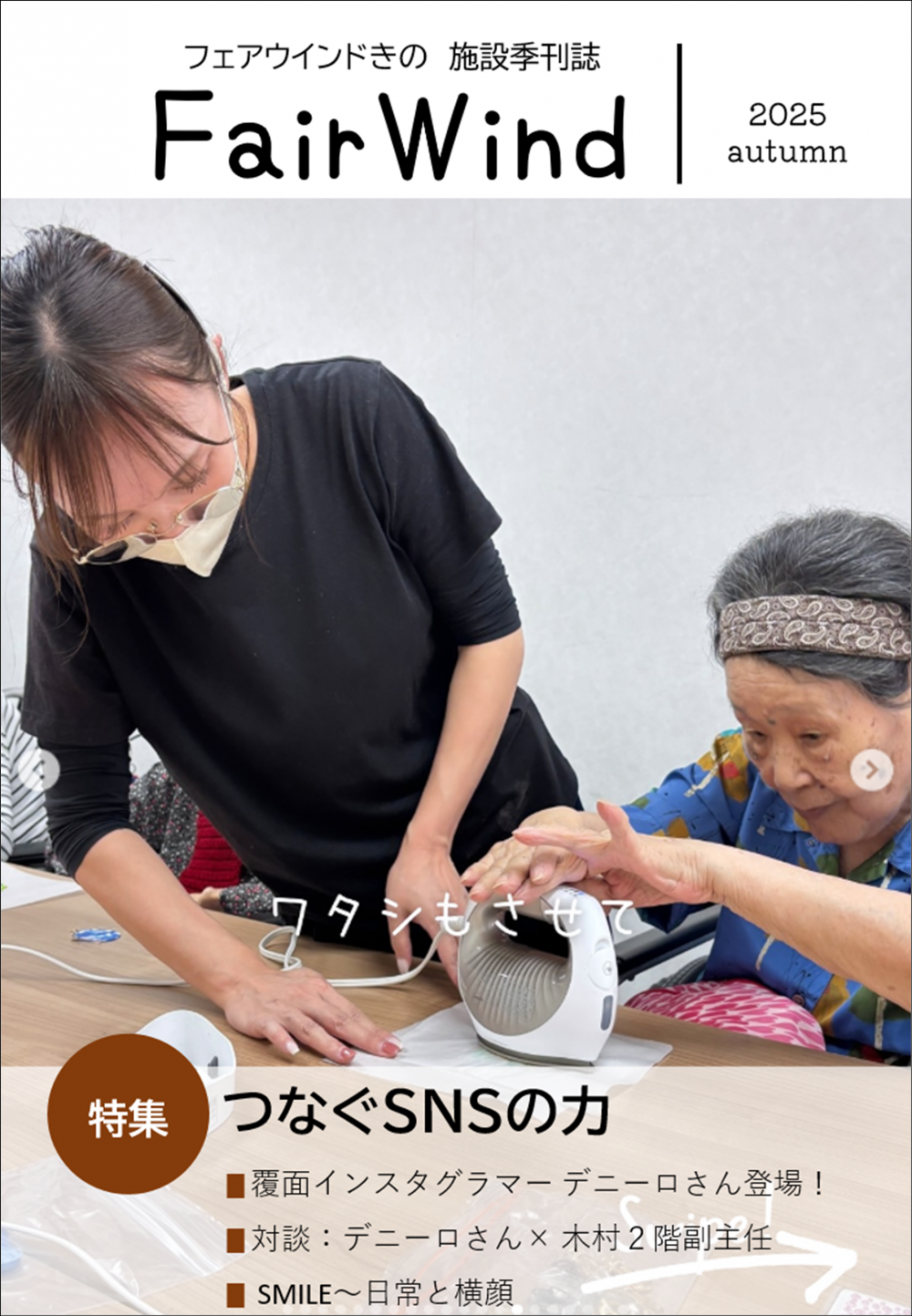 特集:つなぐSNSの力覆面インスタグラマーデニーロさん×2階木村副主任との対談SMILE~日常と横顔介護施設の魅力や日常をSNSを通じて広く発信する取り組みが注目されています。今回は、施設公式SNSを推進するレクリエーション委員長の木村副主任と、独自の感性で発信を続ける職員・デニーロさんに、これまでの歩みやSNSへの思いについて語っていただきました。 |