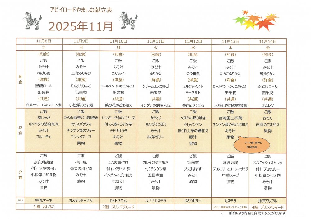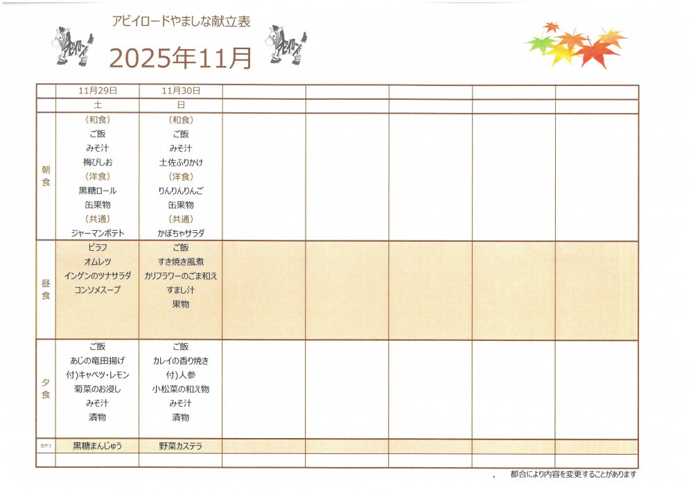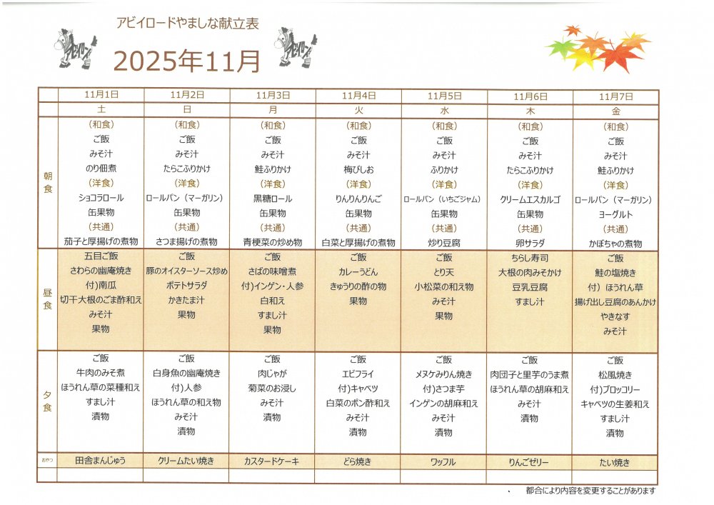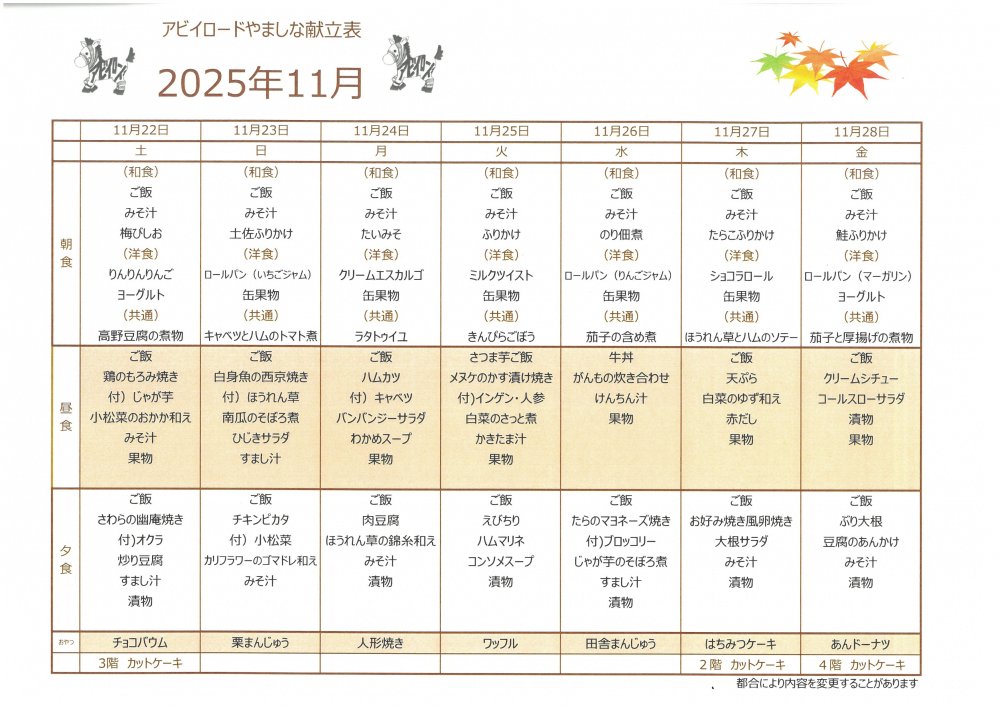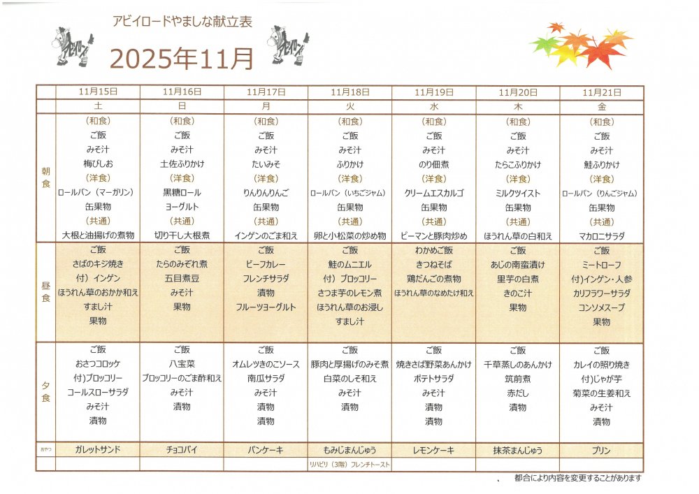 【アビイロードやましな】★献立表★(2025年11月) | アビイ絵巻 | 京都 | 医療法人稲門会_精神科病院・老人保健施設